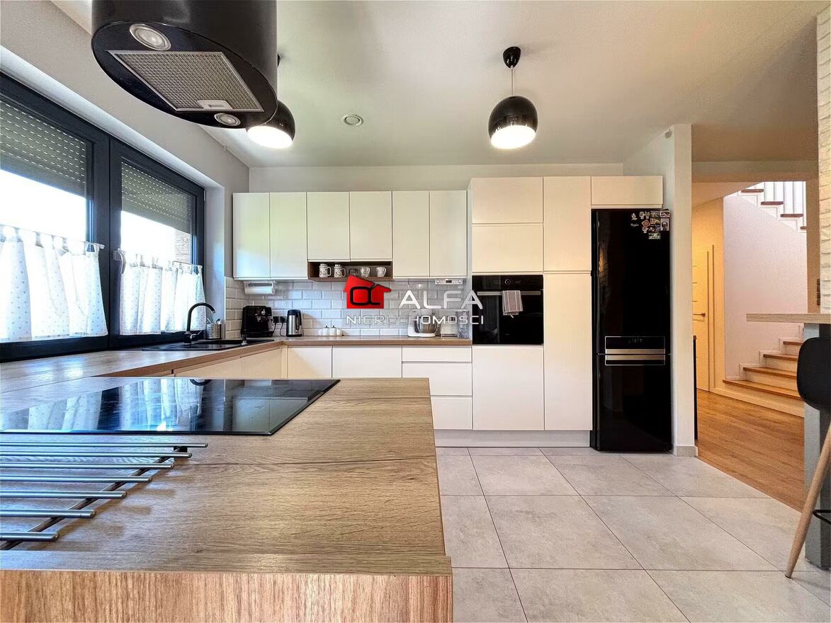 Dom wyposażony jest również w okna 3-szybowe PCV w odcieniu grafitowym oraz okno tarasowe w systemie HST, na podłogach są wysokiej jakości panele oraz płytki, drzwi wewnętrzne i zewnętrzne nowego typu, na ścianach wykonane są gładzie oraz na niektórych ścianach widnieją piękne tapety. Schody w nieruchomości są betonowe, natomiast wykonane zostały nakładki drewniane. Balustrada wykonana z drewna co dodaje klimatu i ciepła we wnętrzu.